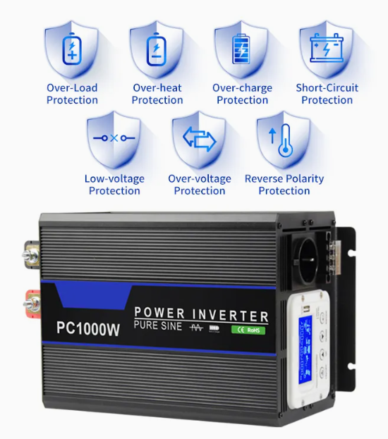- integrierte LCD-Anzeige für Eingansspannung, Ausgangsspannung, Fequenz, Temperatur und Lade- Entladeanzeige